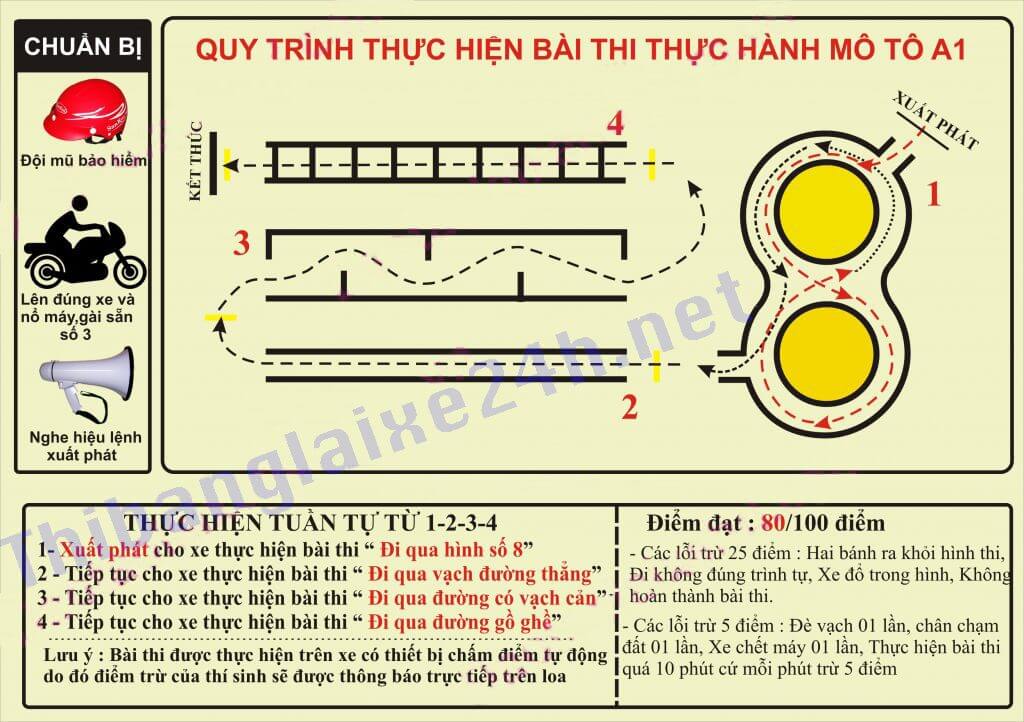 Các bạn lưu ý, hiện nay thi thực hành bằng lái xe máy hay bất cứ 1 loại xe nào đều thi trên xe gắn chip (chấm điểm tự động), nên các bạn phải tập 1 cách cẩn thận các bài thi thật nhuần nhuyễn mới có thể đạt yêu cầu.